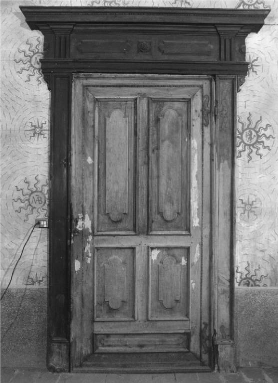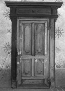 Porta a un unico battente di massello di noce color naturale, lucidato, decorata con quattro formelle mistilinee poste entro cornicette in rilievo, serramenti in ferro originali, sormontata da stipite ligneo con pesante timpano molto sporgente e decorato con piccole formelle e fiore stilizzato, priva di serratura.
