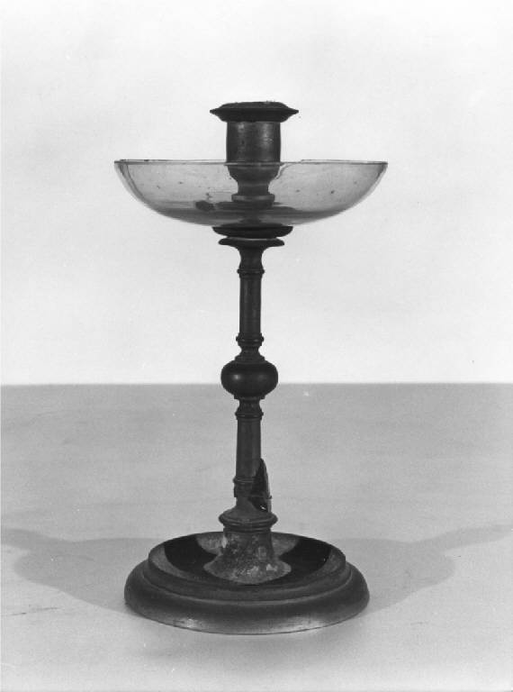 Candeliere a una luce, d'ottone fuso con base rotonda gradinata e convessa, su questa poggia il fusto rotondo ornato al centro con sfera schiacciata, portacandela tornito con piatto di vetro soffiato.