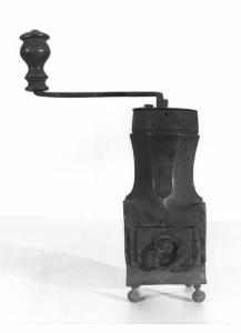 Macinacaffè, arredo di ferro con parti di metallo fuso, con base quadrangolare poggiante su quattro piccoli piedi sferici, su una specchiatura della base si apre il cassettino per raccogliere il caffè già macinato, munito di impugnatura ad anello di ferro, sulla base si poggia il recipiente sagomato con coperchio munito di maniglia rigida con pomolo tornito.