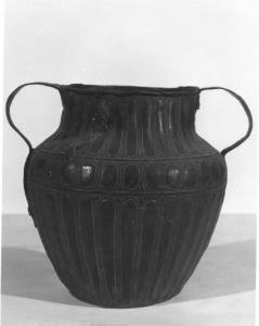 Vaso panciuto e biansato di rame, ornato con doppio ordine di baccellature e al centro di ovoli ritmati entro cornice bulinata, due manici rigidi e ricurvi applicati con chiodi.