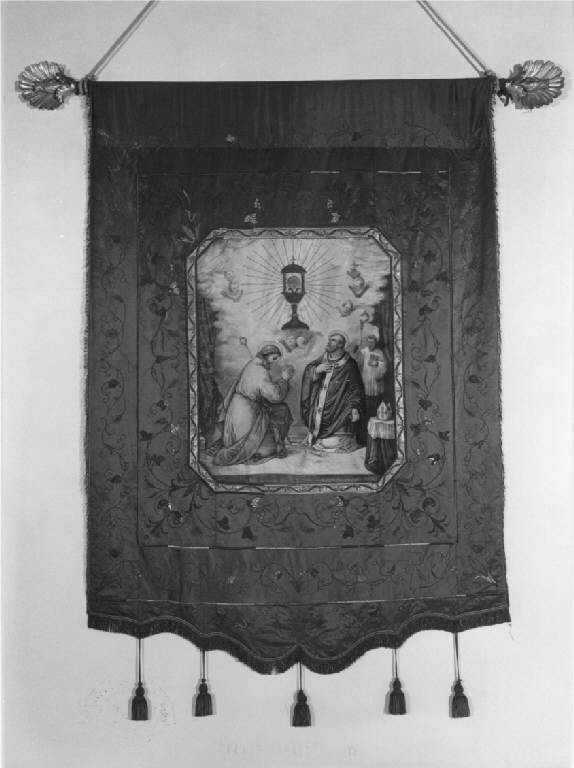 Stendardo processionale di raso di seta ricamato e con parti applicate dipinte, raso rosso vinato ricamato con motivi decorativi a tralci di spighe alternati a rami di vite, al centro scena ottagonale dipinta a colori vivaci raffigurante, secondo l'iconografia tradizionale, i Santi Giuseppe a sinistra e Ambrogio a destra, inginocchiati in adorazione di un ostensorio con l'Eucaristia, a sinistra un chierico regge il pastorale, verso: raso bianco rosaceo ricamato a fiori e motivi a scacchiera di filo dorato, al centro scena ottagonale dipinta a tempera con la Vergine del Rosario con Bambino in grembo, trionfo di cherubini, canutiglia a cinque pendagli dorati, appeso al bastone di legno intagliato e dorato.