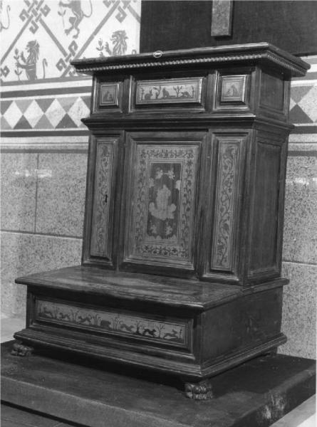- NOTIZIE STORICO CRITICHE Arredo prezioso realizzato nel sec. XVII con qualità formali, scelta dei legni e motivi ornamentali comuni nell'area lombarda, più propriamente bergamasca-bresciana, la tipica struttura massiccia e severa in noce alleggerita da intarsi e filettature in legni di pero e melo, vivaci motivi ornamentali con animali, piante, figura scure su sfondo chiaro e parti anche intagliate. Si conservano ancora molti di questi arredi ispirati soprattutto dagli armadi della sagresta nuova della basilica di S. Martino ad Alzano lombardo e in particolare ai due credenzini opera di Andrea Fantoni e Famiglia ( Pinetti 1931, p. 153 )
