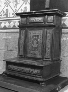 Inginocchiatoio del tipo chiuso, impiallacciato in noce con intarsi e filettature di legno di pero, parte frontale con formella centrale raffigurante l'Assunta e putti; due minori laterali con rami fioriti, all'interno dieci cassettini, quattro più grandi e sei piccoli, con formelle intarsiate, pomoli di legno tornito, nella parte superiore con cassetto e inferiore con decorazione a tarsia con animali: lepri, cani, gatti e alberi stilizzati, inginocchiatoio con piano ribaltabile decorato con ornamenti simmetrici intarsiati come il piano d'appoggio di probabile fattura ottocentesca, semplici fianchi lisci, poggiante su quattro piedi, quelli anteriori ferini