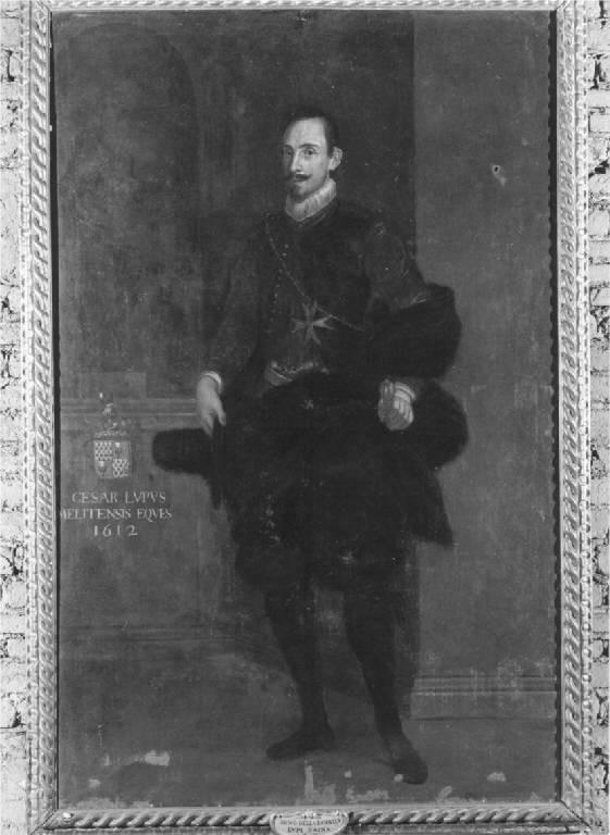 E' raffigurato il personaggio a figura intera, in età matura, con baffi e barbetta, corpetto, pantaloni, calze nere e con manto nero di pelliccia avvolto sulle spalle, nella mano destra un ampio cappello nero, nella sinistra il bastone, sul petto la croce dell'ordine militare dei Cavalieri di Malta, fondo scuro ad architetture, a destra in alto arma: inquartato nella 1 e 4 con fasce ondate, 3 e 4 fiore fiorito dall'elmo con svolazzi, corona, cimiero da cui esce lupo con giglio nella zampa sinistracornice di legno intagliato.