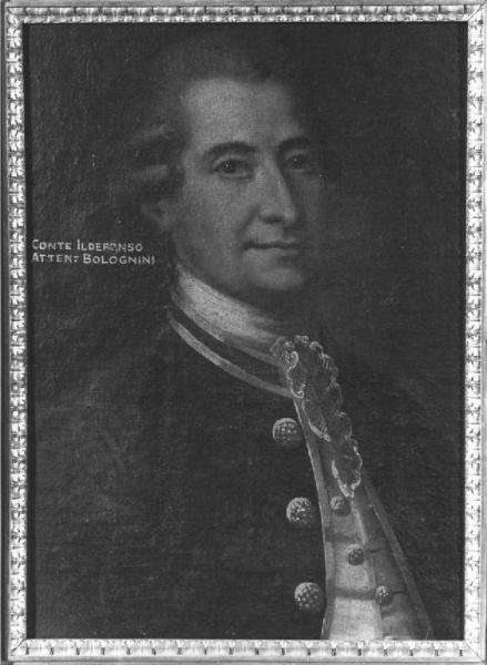 - NOTIZIE STORICO CRITICHE Dipinto di tipo convenzionale e di non grande qualità è stato eseguito da anonimo pittore lombardo. Ildefonso del ramo terzogenito figlio di Ferdinando e di Maria Maddalena dei marchesi Visconti, nasceva a Milano il 17 agosto 1696. Fu capitano al servizio dell'Austria. Il 13 agosto 1762 il vescovo di Lodi, conte Gallarati lo eleggeva protettore del conservatorio delle Cappuccine nel borgo di S. Angelo Lodigiano; nel luglio 1765 Carlo Emanuele re di Sardegna investiva Angelo, Ildefonso e Ferdinando Attendolo Bolognini della sesta parte del feudo di Olevano ( Calvi 1884, tv. X )