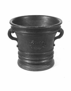 - NOTIZIE STORICO CRITICHE Arredo di tipologia ancora secentesca realizzato da una fonderia fiorentina, alleggerito tuttavia nelle anse e nel cartiglio con i motivi decorativi. Per confronti stilistici si vedano gli esemplari della raccolta e quelli conservati nel Museo Nazionale dell'Arte Sanitaria di Roma ( G. Lise, Antichi mortai di farmacia. Milano, 1975 ) oltre agli altri conservati nella raccolta