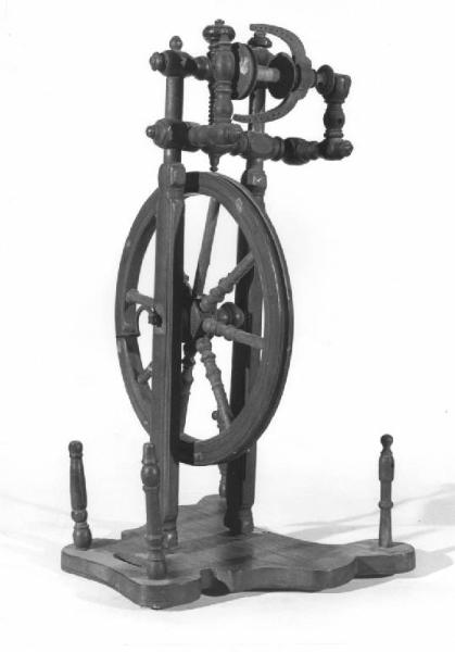 Attrezzo di massello di noce color naturale, lucidato, poggiante su base sagomata, su cui sono applicati agli angoli quattro pilastrini torniti a "fusello" per i gomitoli, grande ruota e sostegni torniti.