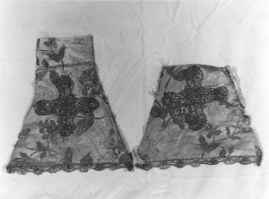 Due frammenti di piccole proporzioni di una stola liturgica di broccato di seta a rami fioriti e foglie, broccati in filo d'oro su fondo avorio, trina di filo dorato coeva come la croce applicata ad ago.
