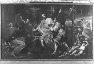 - NOTIZIE STORICO CRITICHE Sembra di poter identificare l'autore del dipinto con Tommaso Formentino, attivo nel Duomo di Milano, a Pavia Como e Brescia. Modesto autore di stile giordanesco lombardo ampiamente rappresentato nelle chiese milanesi che si ispira a consimili figurazioni veronesiane e con una costante tendenza a evasioni data la mancanza di una più salda tradizione figurativa lombarda. Attribuzione che sembra confermata nel modo di trattare la materia, in certi volti e nelle teste dei vecchi che appaiono sul fondo della scena, si veda per confronti stilistici S. Elena presenta due sacri chiodi a Costantino dello stesso autore del Duomo di Milano ( Arslan 1960, p. 143-144 ).