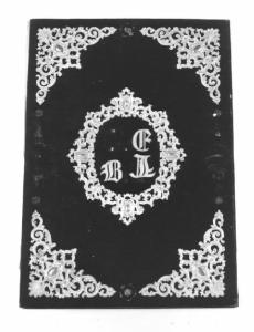 Copertura di velluto blu scuro, con ornamenti di metallo dorato fuso, recto: stemma entro cartiglio (mancanti), sugli angoli decorazioni di vegetali e volute sugli angoli, tutti di metallo dorato fusi e applicati (mancano le quattro pietre incastonate e altrettante borchie); verso: sugli angoli gli stessi ornamenti e al centro in lettere GE - BL di cui manca la G, la parte interna di carta patinata bianca è costituita da due pagine di dedica frontespizio (cfr. iscrizione), due pagine di prefazione, 17 pagine di testo e una tavola riassuntiva oltre a due pagine bianche, corona dipinta ad acquarello con greche grigie con rose, viole e foglie in rosa e verde, scritta in blu, oro e argento oltre allo stemma familiare in rosso.
