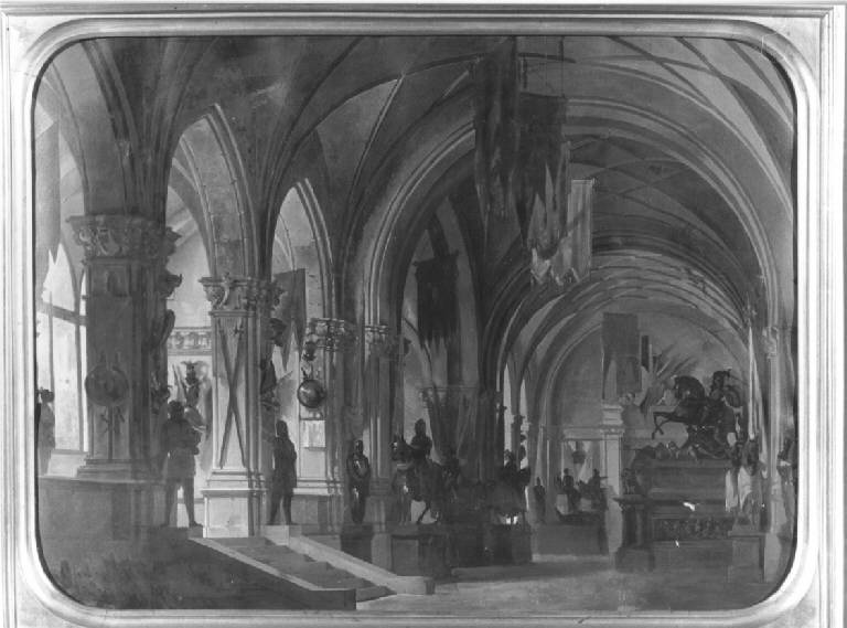 E' raffigurato l'interno di un mausoleo a grandi arcate e adorno di molte statue equestri, vessilli e trofei guerreschi, toni dorati; cornice di legno dorata coeva.