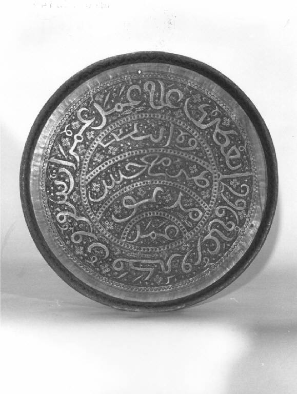Piatto rotondo di ottone battuto, fondo interamente decorato con lettere cufiche racchiuse al centro da quattro cornici, piccoli fori sparsi sul fondo, bordo ribattuto e ornato con leggero bordo inciso.