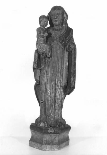 Statua a tutto tondo, piedistallo ligneo quadrangolare coevo, raffigura la Madonna a figura intera, con tunica rossa e manto blu, mentre regge sul braccio destro il Bambino.