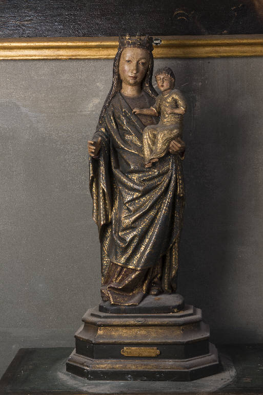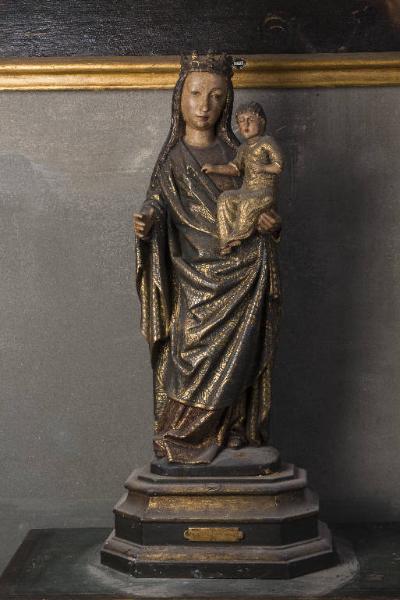 Statua a tutto tondo, piedistallo ligneo quadrangolare non pertinente, raffigura la Madonna a figura intera, con tunica rossa e manto azzurro, mentre regge sul braccio sinistro il Bambino, sono entrambi dorati, al capo della Madonna una corona.