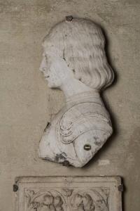 Giovane gentiluomo, di profilo, con lunghi capelli e leggera armatura con tre spallacci.