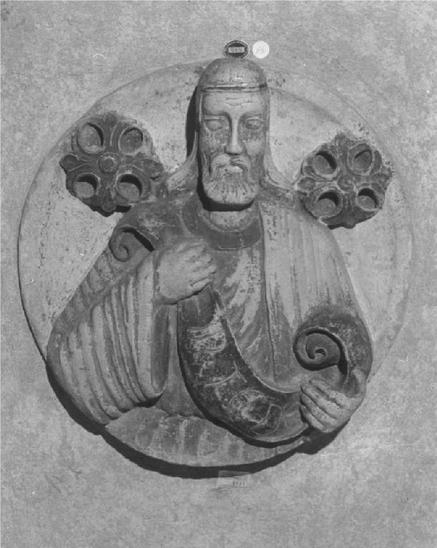 Il tondo presenta tracce di polocromia, nella parte superiore due motivi decorativi a quadrilobi, raffigura, a mezzo busto e con ampia tunica, un profeta barbuto e dai lunghi capelli che tiene tra le mani un cartiglio.