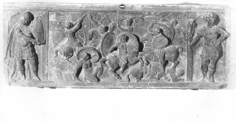 Altorilievo raffigurante una battaglia tra cavalieri con corazze e scudi rotondi, in primo piano cavalli e soldati caduti, sullo sfondo edifici, a lato della scena guerresca divisi da una piatta lesena due soldati romani con scudo e bastone.