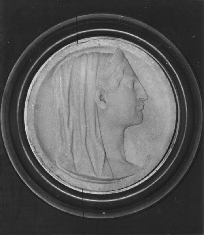 Cornice modanata di legno tinto di nero, con fenditure, raffigura una testa femminile con velo, di profilo.