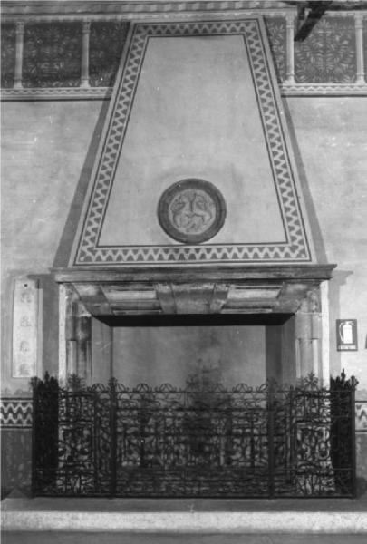 Il camino, ad andamento rettilineo presenta due piedritti laterali modanati, sull'ampio architrave leggermente rientrante ci sono tre fasce, di maggiori dimensioni, la centrale, con decorazione nastriforme, piano aggettante, interamente protetto da una grande grata in ferro del XVIII secolo.