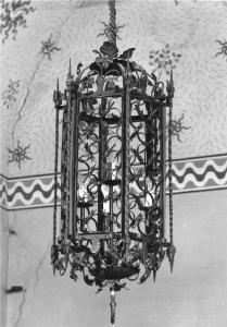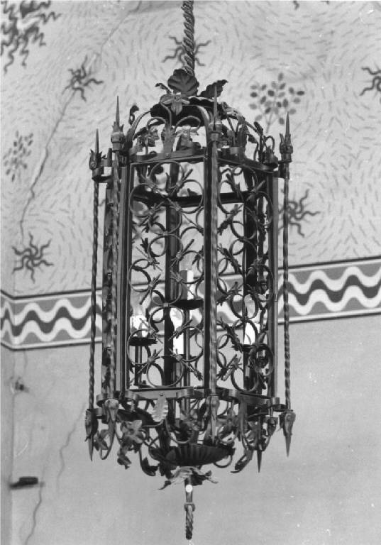 Il lampadario presenta sei specchiature ornate da quadrilobi a giorno e leggere foglie sbalzate applicate alla base e sulla sommita; è appeso al soffitto con sostegno di ferro a forma di corda.