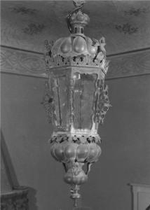 Il lampadario presenta quattro specchiature sagomate con vetri trasparenti e ornate con decorazioni floreali fuse e applicate, cimato da cupola a grosse baccellature arricchite da tre piccoli putti a tutto tondo e applicati ripresi nel corpo inferiore a doppio corpo.