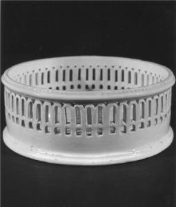 - NOTIZIE STORICO CRITICHE Nell'intento di esaltare con un motivo ornamentale il candore delle loro terraglie, i ceramisti pesaresi del primo '800 ricorrevano frequentemente a motivi geometrici traforati, ottenuti con un semplice procedimento di intaglio. Questi motivi a traforo vennero così adottati in gran numero per sottobottiglie, sottobicchieri, piatti e vassoietti. E' per merito del pittore romano Pietro Latti (1778-1834) divenuto direttore della ditta che più tardi prenderà il nome di Benucci e Latti, che viene introdotto a Pesaro un clima di rinnovamento, in particolare sulla terraglia ad uso inglese. Per confronti stilistici con analoghe coeve tipologie attribuite a questa fabbrica pesarese, si veda Biscantini 1986, pp. 154-157; 179 e ss. Costituivano, assieme ai portasale, portabottiglie, ampolliere e portastecchini e altre suppellettili, quel corredo di elegante semplicità che impreziosiva le mense raffinate della seconda metà dell'800