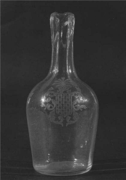 Bottiglia di vetro trasparente a base circolare, con collo allungato e stretto e rigonfia sulla parte superiore, decorata con stemma nobiliare della famiglia Litta.