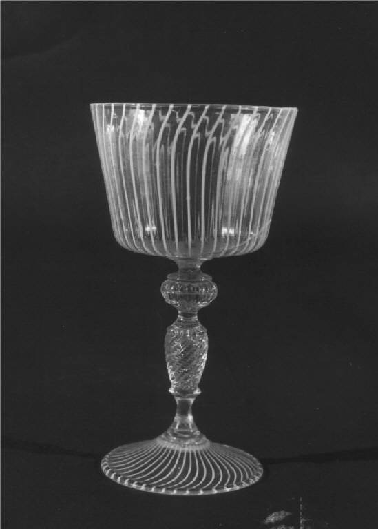 Calice di vetro cristallino ornato nella coppa, piuttosto larga, con fasce di vetro lattimo bianco riprese anche sul piede a disco, gambo costituito da una sfera schiacciata e da fuso lavorati in rilievo.