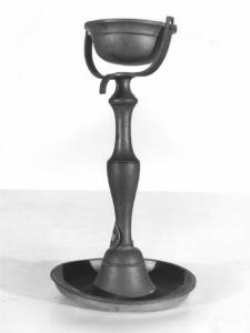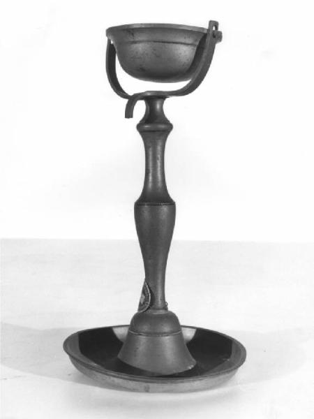 Su una base circolare con bordi rialzati poggia lo stelo a fusello allungato terminante con sostegni rigidi reggenti una vaschetta mobile.