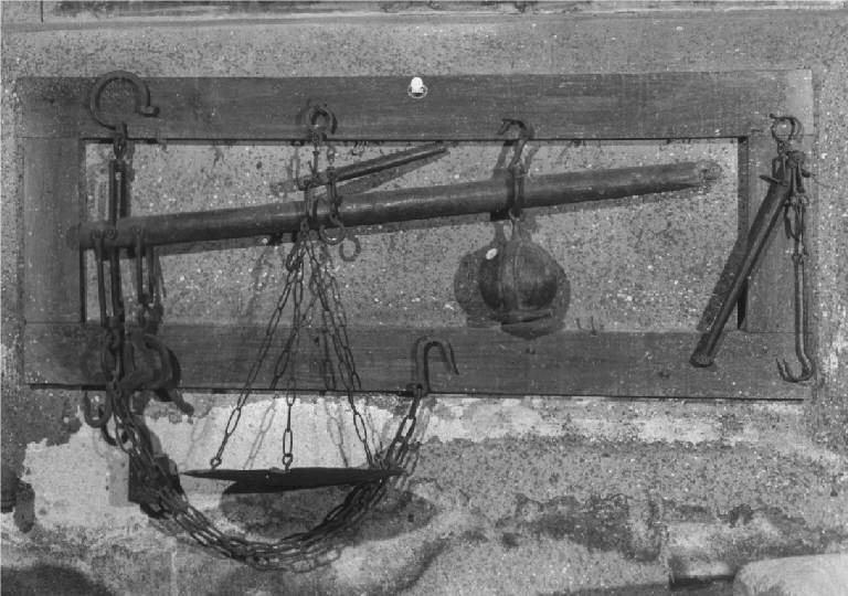 Bilance manuali di ferro con i piatti e peso sostenuto da un bastone di legno tornito e da un gancio di ferro.