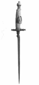 Pomo sferoidale con incisione al diametro con bottoncino e basettina, crociera quadrotta incisa con brevi bracci diritti a nodi e cornicette, manica non sua di corda, lama con tallone a nodo e cornicette, poi a sezione triangolare, numerata da 9 a 120.