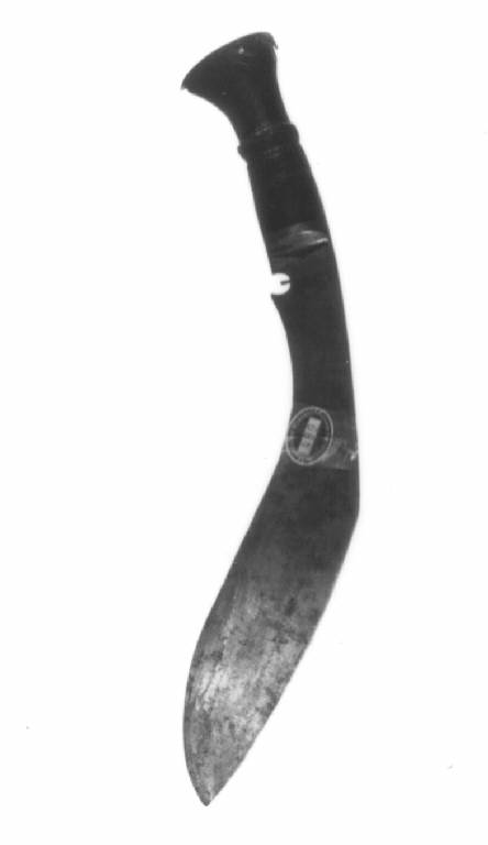 Kukri, pugnale, impugnatura di legno coperta da cappetta con codolo e allargantesi verso l'alto, rigrosso ad anello circa a metà, pesante lama ricurva a sezione triangolare a un filo.