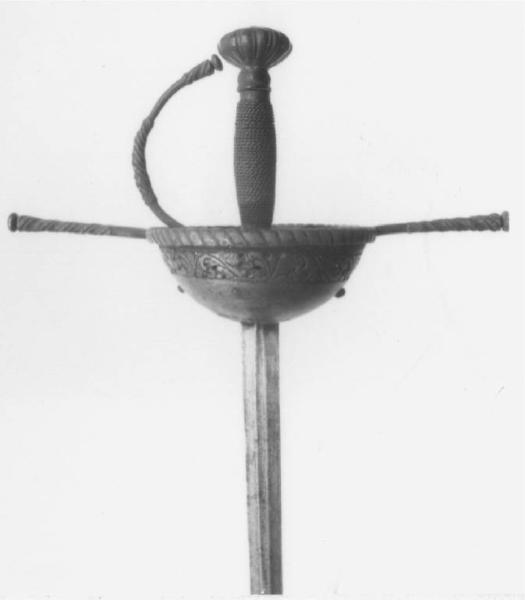 Pomo a fico scanalato con basettina, impugnatura a fuso, manica a cordelline tra ghiere, crociera a scudetto, bracci diritti,,guardia e archetti brevi cui è avvitata la tazza, elementi in tondino con rigrossi spiralati ai colmi e alle estremità finite a bottone, tazza a calotta con rivoltino basso finito a finto tortiglione, reca in alto una lista gravata a fogliami, in basso una corona solo gravata a petali, lama non pertinente a sezione esagonale, tallone in forte rincasso.