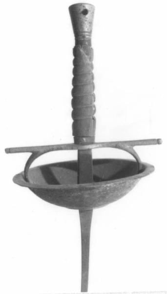 Fornimento in acciaio nichelato con pomo tronco conico attraversato da un foro nel quale si inseriva un ferro come leva, manico in legno a sezione circolare variabile a rigrossi destrogiri e ricoperto di pelle di pesce, gavigliano, archetti e coccia, lama piatta al ricasso, si restringe fino ad assumere una sezione quadrata con bottone terminale.