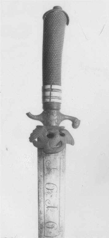 Impugnatura di corno a sezione ovata, leggermente ricurva e allargantesi verso l'alto, lavorata a zigrinature a piccoli rombi, bottone al sommo con codolo ribattuto su placchetta sagomata sormontata da anello in osso lavorato a scanalature parallele, blocchetto in ottone inciso a fogliami, con brevi bracci, uno spinto in alto, l'altro in basso, finiti a bottone di cui uno mancante, piccola pelta ribassata e traforata in forma di cigno dalle ali aperte, lama a due fili, a sezione lenticolare, al forte decoro a intrecci e targa incisa con la data 1616, lupo su ambo i lati