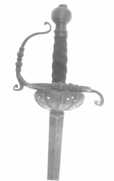Pomo sferoidale con bottone e alta basettina, impugnatura a fuso con rigonfi spiralati destrogiri con camicia di treccioline e a ghiere di rame, guardia finita a ricciolo con dischetto e rigrossi al colmo; in basso si stacca altro ricciolo e un ramo orizzontale sopra la tazza con identico dischetto e rigrossi al colmo e terminante nel braccio di parata, braccio da parata rivolto in basso e finito a ricciolo, dallo scudetto si diramano gli archetti, fissati a vite alla tazza a doppia valva, asimmetrica, costolata in quattro spicchi e a giorno, lama costolata a sezione di losanga con tallone sodo.