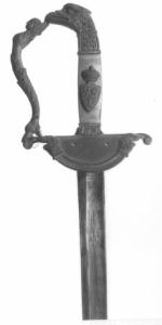 Fornimento con testa di aquila dal lungo becco, impugnatura a sezione rettangolare con al centro applicato uno scudo con le lettere F.G.I., sormontato da corona,guardia antropomorfa con cariatide alata, bracci di guardia e di parata terminanti con piccola voluta rivolta in basso, difesa a pelta ribassata con profilo inciso a toccature e terminante in due cespi acantacei, al centro due fori per le viti che dovevano reggere una decorazione applicata ora perduta, lama sua a un filo con decori in morsura a trofei d'arme, appena leggibili.