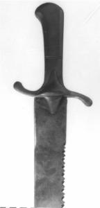 Fornimento gettato in ottone in pezzo unico, impugnatura in sezione quadrata scantonata, elso a S con terminazioni bulbate, alette a rombo, lama seghettata con doppia dentatura sfasata e punta falcata a filo.