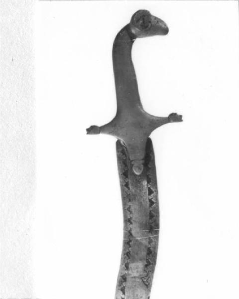 Impugnatura allungata e piatta in ottone, terminante a protome caprina con due grosse corna, elso a crocette, crociera piatta e bracci diritti a sezione rettangolare decrescenti verso le estremità finite a bocci, lama a onde a un filo, decoro geometrico inciso a triangoli scavati.