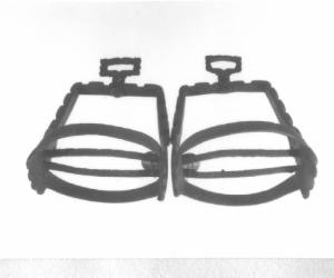 Branche in lamina piatta, incise a profonde bande orizzontali, formano una struttura trapezoidale, occhio rettangolare sagomato a profilo complesso, le branche terminano in basso con un allargamento palmare a quattro lobi, cui è saldato il predellino in lamina piatta decorata a toccature verticali e due barrette a sezione quadra leggermente arcuate sul piano.
