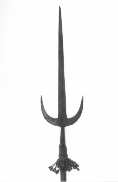 Gorbia in tronco di piramide, a sezione decagonale, con bandelle, di cui una tronca, morente sullo stacco dei rebbi a sezione di losanga e ben rivolti verso l'alto, cuspide a sezione di losanga, asta moderna a sezione circolare con fascetta in pelle a stringere le bandelle e nappa.