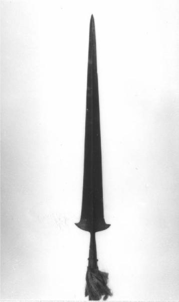 Gorbia in tronco di cono con bandelle, lama nervata a tutta lunghezza con brevi alette e fili diritti fino alla punta cuspidata, asta ottocentesca e nappa.