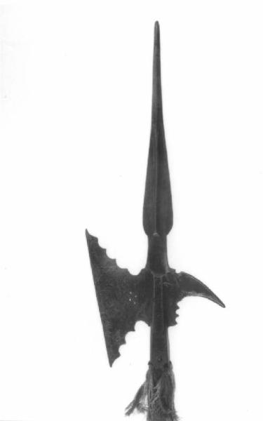 Gorbia con bandelle, di cui una spezzata, che si tronca sul ferro, scure a filo diritto con lati obliqui lavorati a cuspidi, a giorno con una rosetta a quattro fori, becco con lembo di uscita cuspidato, cuspide con base a sezione rettangolare, allargata a lama costolata, con quadrello a sezione romboidale, la scure è completamente incisa con decori vegetali e una figura di uomo in arme su ogni piatto, asta moderna e nappa.