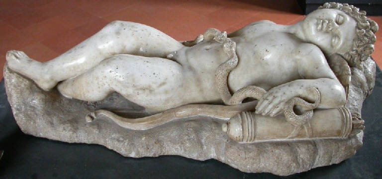 - NOTIZIE STORICO CRITICHE Il bellissimo fanciullo dalle proporzioni perfette, dal viso angelico ammorbidito dal sonno, appare essersi lasciato andare ad un sonno profondo ed innocente direttamente sulla nuda terra. La presenza della corona di rose tra i capelli ricciuti, attributo di Venere, delle piccole ali e soprattutto la presenza dell'arco e delle frecce custodite entro il turcasso dichiarano in modo incontrovertibile la sua identificazione con Eros fanciullo. Riverso sulla schiena, il braccio destro adagiato lungo il corpo, il sinistro piegato a proteggere in un gesto di possesso le armi, il piccolo Eros è colto e raffigurato con una dolcezza disarmante rafforzata dalla tenerezza delle guance paffute e dalla resa setosa e morbida degli incarnati, lavorati nel marmo con notevole sapienza ed esaltati nella morbidezza grazie anche al contrasto con la lavorazione irregolare e scabrosa del ruvido giaciglio.Contrasta con l'innocenza del fanciullo la presenza delle due serpi che si fronteggiano sul suo ventre, una avvolta le spire attorno all'avambraccio destro, l'altra sgusciata sotto la mano sinistra del dio addormentato. Il loro significato non è stato ancora decodificato correttamente ma la loro presenza può essere riferibile tanto ad una dimensione neoplatonica tipica di molte corti italiane a partire dalla fine del Quattrocento, quanto alla cultura emblematica di metà Cinquecento.\nL'opera apparteneva alle collezioni di Vespasiano Gonzaga. Dal 1584 è infatti registrata come presente nel Palazzo Ducale di Sabbioneta, nella stanza dei Miti, entro una specchiatura ovale sopra la finestra. Passato alla fine del Settecento (1774) nel Museo Statuario istituito a Mantova da Maria Teresa D'Asburgo, l'opera, di proprietà civica, è passata in Palazzo Ducale dove è rimasta dal 1917 al 2005 quando è stato istituito il Museo della Città di Palazzo San Sebastiano.