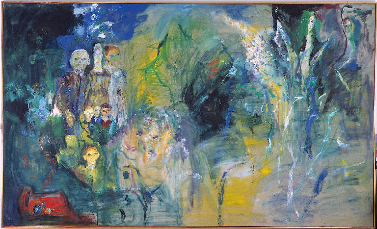 - NOTIZIE STORICO CRITICHE Dipinto dopo la conclusione di Un popolo di volti, metamorfosi riprende il motivo del ritratto psicologico in chiave intimistica, di riflessione dell'artista su se stesso e sulla propria storia. Nonostante la complessità compositiva, questa volta la grande tela non è il frutto di continue sedimentazioni, come Un popolo di volti, ma eseguita quasi di getto, anche se evidentemente non in un'unica volta. Nonostante ciò, e al di là della gestualità accesa della pittura, si tratta di un lavoro costruito di testa, in base, si direbbe, a un preciso programma, dove i diversi elementi iconografici fanno riferimento puntuale alla vicenda privata e professionale dell'artista, in un ritratto globale nella vita e nel sogno. Da sinistra a destra si riconoscono gli arnesi del lavoro (il martello e la tenaglia su un panno rosso, ripresi da una serie di disegni del 1969); la famiglia dell'artista, il padre, la madre, la nonna e i fratelli, con Ernesto che nasce da un cavolo; infine una farfalla - modello esemplare di metamorfosi - che figurativamente costituisce uno dei capostipiti delle successive figure-fiore. Il tutto in un contesto naturalistico assimilabile a quello delle siepi più convulsamente informali. "Paradosale autoritratto. Memoria del quotidiano, storia, natura, fiaba, le età della vita, lo stare insieme e l'espandersi, il divenire altro senza negarsi... La costruzione di legami mediante mutamenti, il riepilogo di vicende che, grandi e misteriose, appartengono alla condizione umana: a causa di tutto questo proprio l'autoritratto come attenzioene a se stesso viene sopraffatto" (De Bartolomeis, 1980)