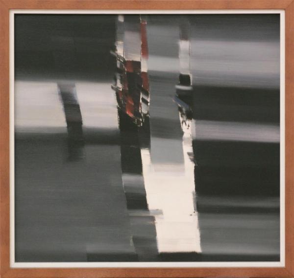 Composizione informale sui toni grigi, neri e bianchi con tocchi di marrone acceso, di impianto geometrizzante reso con pennellate orizzontali su diversi piani segmentati.