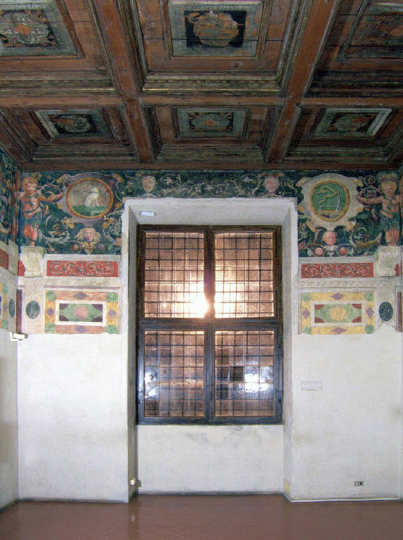 - NOTIZIE STORICO CRITICHE La camera delle Imprese prende il nome dalla raffigurazione ad affresco, nel fregio superiore, di 15 imprese appartenenti a Federico II Gonzaga e alla sua famiglia: al bisnonno Ludovico II, nel caso degli emblemi del guanto e della torre, e al padre Francesco II relativamente alle divise del crogiolo e della museruola. Nessun documento cita esplicitamente questo luogo, ma grazie all'iscrizione incisa sul camino, che indica ancora marchese, e non duca, Federico II, è possibile datare la decorazione ad affresco prima del 1530, presumibilmente nel 1527, anno in cui furono realizzati anche gli affreschi nella adiacente camera di Ovidio. L'apparato ornamentale, da leggersi con punto di vista collocato accanto alla finestra posta al centro della parete nord, è costituito da un ricco fregio che percorre la parte superiore delle pareti, diviso dal rivestimento marmoreo policromo dipinto sottostante, da un cornicione modanato scandito da mensole. Tanto gli elementi architettonici dipinti quanto i rivestimenti marmorei delle pareti che imitano le varietà di giallo, verde e nero antico di pavonazzetto e di porfido rosso, sono resi illusionisticamente. La parte inferiore delle pareti, da 1,50 metri d'altezza sino a terra, è priva di decorazioni in quanto anticamente le pareti venivano ricoperte da cuoi cordovani che meglio garantivano l'isolamento termico.\nNella fascia decorativa superiore, caratterizzata da colori molto vivaci, emergono, da racemi vegetali, figure di putti reggi-impresa che indossano perizomi di foglie e collane di viticci e che poggiano su mensole dipinte, collegate fra loro da un cornicione e da un fregio a grottesche su fondo rosso scuro. Nei quattro angoli della camera i putti sono raffigurati a coppie, abbracciati. Si alternano ai putti i cartigli che contengono le imprese gonzaghesche. Sotto le imprese una serie di maschere dalle smorfie irrispettose appaiono tra i girali vegetali. Spicca al centro del fregio della parete Sud lo stemma delle quattro aquile della famiglia Gonzaga. \nUn'accurata analisi ha permesso di individuare piccolissime tracce di doratura su alcuni risvolti dei cartigli contenenti le divise delle pareti Ovest e Sud. Questa importante e significativa scoperta può costituire un'ulteriore conferma della ricchezza, preziosità e vivacità cromatica con cui venne concepita ed eseguita la decorazione pittorica della camera delle Imprese. L'impresa, detta anche divisa, è un emblema formato da un'immagine, detta "corpo", spesso accompagnata da un motto, "anima", espresso in una lingua straniera. Nata nel Medioevo, l'usanza di ricorrere alle imprese si diffuse durante il Rinascimento, proseguendo poi nel Seicento e nel Settecento. Essa poteva essere tramandata di padre in figlio o donata a persone fidate e veniva utilizzata per esprimere, attraverso simboli e frasi, un desiderio, un proposito o un modo d'agire, oppure per riferirsi a vicende storiche o a segreti amorosi rappresentati in modo enigmatico. Il letterato Paolo Giovio, infatti, affermava che l'impresa non deve mostrarsi troppo esplicita da essere intesa da tutti, né del tutto oscura. Le imprese personali di Federico, riprese con insistente frequenza anche in altre sale del palazzo, sono, per quanto concerne la sfera privata, la salamandra e il boschetto, mentre il Monte Olimpo si riferisce al versante ufficiale della sua vita.