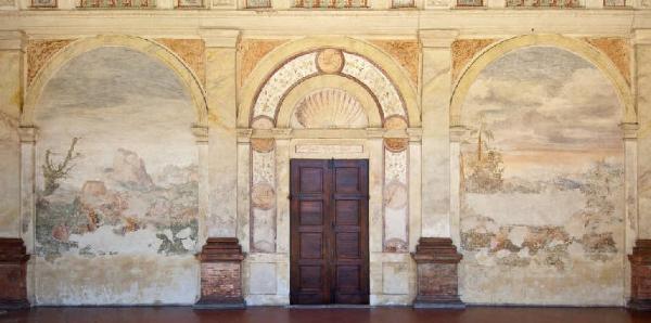 - NOTIZIE STORICO CRITICHE Al centro del corpo di fabbrica settentrionale di Palazzo Te, è presente una loggia bipartita: la compongono, infatti, due porticati di eguali dimensioni e identica strutturazione architettonica, separati tra loro da un muro interno la loggia. Se il porticato esterno, verso la città, è privo di decorazione plastica e pittorica in quanto mai portato a termine, il porticato verso il cortile del palazzo è caratterizzato da un ricco apparato ornamentale plastico e pittorico: solo quest'ultimo, pertanto, è comunemente designato con il termine comprensivo di "Loggia delle Muse". L'ambiente, di proporzioni allungate ma piuttosto contenute, è un vestibolo aperto tra due luoghi destinati a una fruizione pubblica - la Camera del Sole e della Luna (lato ovest) e la Sala dei Cavalli (lato est) - e costituisce, dunque, un importante punto di passaggio nel cerimoniale delle visite ufficiali. Il nome con cui l'ambiente è oggi designato deriva dagli studi di Hartt (1958) che per primo lo denominò "Atrio delle Muse" in virtù dei soggetti inclusi nella decorazione. Le date di realizzazione cadono, così come per gli altri ambienti del corpo di fabbrica settentrionale, nella prima fase dei lavori della villa, tra 1527 circa e 1530: Belluzzi sottolinea che le caratteristiche araldiche degli stemmi dipinti sulle testate escludono una datazione oltre il 1530 - anno dell'elevazione di Federico II Gonzaga a duca - mettendo così in discussione la proposta avanzata da Oberhuber, secondo cui le lunette affrescate risalirebbero, per motivi stilistici, al 1532 circa. Incerta l'attribuzione dei bassorilievi in stucco e dei dipinti, a causa della mancanza di dati documentari: sulla scia di Carpi e Hartt, Oberhuber assegna le lunette delle testate a Rinaldo Mantovano - attribuzione che pare essere accolta da Belluzzi - e i rilievi di tondi e semitondi in stucco a Giovan Battista Scultori. Il pessimo stato di conservazione delle favole mitologiche affrescate sulla parete settentrionale non consente, al contrario, ipotesi di attribuzione di tali brani. L'impostazione decorativa delle due testate occidentale e orientale è identica. La superiore cornice ad arco in stucco, affine alle nervature della volta, è decorata da quattro scomparti con girali vegetali a bassorilievo alternati a tre tondi centrali e due semitondi all'imposta dell'arco, nei quali compaiono oggetti e figure in bassorilievo su fondo scuro. Nella lunetta della testata occidentale è dipinto il dio Apollo, adagiato su un triclinio di roccia; lo accompagna il cavallo alato Pegaso. Gli attributi assegnati alla divinità alludono all'invenzione letteraria: la tematica poetica è in connessione con l'iconografia delle nove Muse palesata nella volta della loggia e ripresa anche nella lunetta della testata opposta, nella quale figura - secondo la critica più recente - un'allegoria delle Arti mantovane, impersonata da una giovane donna con vari attributi. La lunetta poggia visivamente sul cornicione in stucco che corre lungo i quattro lati della loggia e che divide la testata in due parti distinte. Nella parte inferiore della testata la porta di accesso alle stanze adiacenti è impreziosita, in entrambi i casi, da un finto portale in marmo, concluso da un frontone triangolare, al di sopra del quale campeggia uno scudo con stemma gonzaghesco; ai lati di quest'ultimo, due putti alati paiono cavalcare una coppia di aquile. Nelle specchiature laterali si osservano maschere di fauni reggenti festoni di verzura con frutti superiormente e, ai lati del portale, finte incrostazioni marmoree (verdi sulla testata occidentale; rosse sulla testata orientale). La parete settentrionale della loggia è suddivisa in tre arcate cieche di eguali dimensioni: la centrale è caratterizzata da un ricco apparato ornamentale incorniciante la porta, nel quale domina il motivo della grottesca su fondo bianco; nelle due laterali sono invece dipinte due favole mitologiche ambientate in ampi paesaggi e tematicamente connesse tra loro: la morte di Euridice (prima arcata) e Orfeo tra gli animali (terza arcata). La Loggia presenta una copertura a botte suddivisa in tre campate da quattro nervature a fascia con decorazioni in stucco: queste ultime corrispondono alle lesene addossate alla parete settentrionale e ai pilastri del lato meridionale. Il ripetersi senza varianti di un identico schema decorativo in ogni campata porta a contare, in totale, sulla volta: nove croci greche con altrettante figure a bassorilievo di Muse nei lacunari centrali e trentasei piccoli cassettoni ad affresco contornati da geroglifici nei quattro bracci di ciascuno; ventiquattro elementi a "T" con girali vegetali; sei elementi a "T" con decorazione floreale e cornice a greca; dodici tondi e otto semitondi in stucco posti nelle quattro nervature in stucco delimitanti le campate.