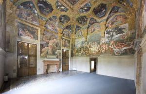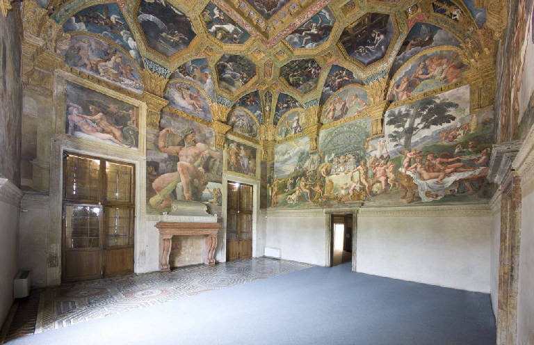 - NOTIZIE STORICO CRITICHE La camera è detta "di Psiche" in quanto il soggetto principale della decorazione dipinta consiste nella vicenda di Amore e Psiche narrata nel romanzo "Le Metamorfosi" (o "L'asino d'oro") di Apuleio (libri IV-VI). La decorazione pittorica e plastica si data, secondo la critica più recente, tra giugno 1526 e la fine del 1528 circa, durante la prima fase dei lavori della villa, concentrati negli ambienti dell'ala settentrionale. L'ideazione, la progettazione disegnativa e la regia complessiva, oltre all'assai probabile esecuzione di determinati brani, spetta a Giulio Romano il quale a Roma, all'interno della bottega di Raffaello, collaborò alla decorazione della Loggia di Psiche della villa di Agostino Chigi, maturando un'approfondita conoscenza dell'iconografia del mito. I collaboratori coinvolti sono i pittori Benedetto Pagni da Pescia, Rinaldo Mantovano, Gianfrancesco Penni e - forse - Gerolamo da Treviso il Giovane, ai quali possono verosimilmente aggiungersi plasticatori del cantiere giuliesco al momento privi di un'identificazione certa. L'iscrizione in caratteri lapidari romani "FEDERICUS GONZAGA II MAR(CHIO) V S(ANCTAE) R(OMANAE) E(CCLESIAE) ET REIP(UBLICAE) FLOR(ENTINAE) CAPITANEUS GENERALIS HONESTO OCIO POST LABORES AD REPARANDAM VIRT(UTEM) QUIETI CONSTRUI MANDAVIT" corre su tutte e quattro le pareti della stanza, separando le dodici lunette soprastanti dalle scene dipinte nella metà superiore delle pareti. La volta della Camera di Psiche presenta eccezionali caratteristiche costruttive e tecniche: diversamente dagli altri soffitti a volta del palazzo, in mattone, essa non è copertura portante in quanto costituita da un'intralicciatura lignea composita sita al di sotto delle catene delle capriate del tetto, alla quale si collegano orditure secondarie che danno forma ai lacunari del soffitto; inoltre i dipinti, a differenza degli affreschi alle pareti, sono realizzati con tecnica a olio, su una base composta da un sottile strato di intonaco applicato a una trama di stuoie di canne. Potrebbe riferirsi all'esecuzione di tali dipinti l'ordine di duecento pennelli "per lavorare a oglio" effettuato da Federico Gonzaga nel giugno del 1526. L'arditezza degli scorci compositivi e le inedite scelte luministiche fanno della volta di Psiche uno dei risultati di maggior impatto dell'arte giuliesca; numerose le letture del ciclo susseguitesi nel tempo, talora inclini alla spiegazione allegorica dei dipinti (D'Arco,1838; Hartt, 1958), talaltra dedicate all'analisi dell'iconografia (Gombrich, 1951; Verheyen, 1972 e 1977; Signorini, 1983). Si segnalano inoltre la proposta di lettura in chiave biografica del ciclo avanzata da Intra (1887) e l'accento posto da Arasse (1985) sulla figura del labirinto, immagine adombrata dall'andamento tortuoso del racconto e dalla polisemia di senso dell'intero ciclo.\nAlla fine del XVIII secolo l' Accademia delle Belle Arti promosse una vasta campagna di restauro dell'apparato decorativo di Palazzo Te. In questo ambito si colloca la decisione, datata al 1784 di sostituire i "salicati" con sontuosi pavimenti di mosaico colorato. Il progetto è affidato a Paolo Pozzo, che, nel disegnare le forme dei nuovi pavimenti, prende ispirazione dalla scansione delle volte e dei soffitti. Entro gli scomparti così ottenuti sono inseriti fregi appartenenti al repertorio classico, motivi geometrici e vegetali. Nel caso del pavimento della Camera di Amore e Psiche, agli ottagoni e semiottagoni del soffitto corrispondono labirinti dal percorso obbligato. In corrispondenza della porta che immette nella Camera dei Venti sono raffigurate due salamandre.