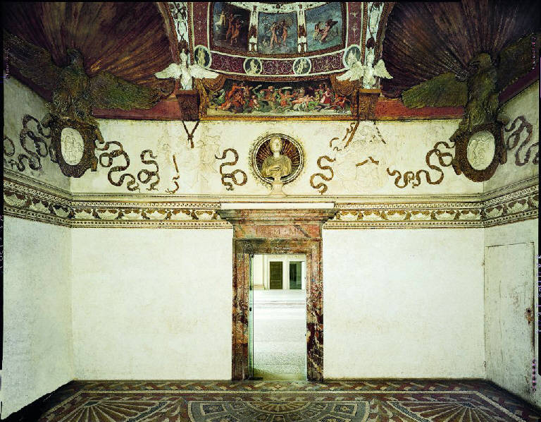 II GONZAGA M M V, Federico secondo Gonzaga quinto marchese di Mantova. Poichè in occasione della sua visita a Mantova, nell'aprile del 1530, Carlo V elevò Federico a duca, tutte le iscrizioni che riportano il titolo di marchese costituiscono un preciso termine ante quem. (Bazzotti 2004). \nNella volta trovano spazio anche quattro bassorilievi in stucco con rapimenti d'amore compiuti dagli dei: ratto di Europa, ratto di Proserpina, ratto di Anfitrite, Mercurio dinanzi a Giove. Per queste scene e per le fasce in stucco con amorini vendemmianti è stata ipotizzata l'attribuzione a Primaticcio. Alla base delle lunette corrono le concitate battaglie tra Greci ed Amazzoni, Lapiti e Centauri, Nereidi e Tritoni scelte come metafore del trionfo della civiltà sulla barbarie.\nE' il più piccolo tra gli ambienti decorati dell'ala orientale e fu utilizzato da Federico II Gonzaga come camera da letto. Al di là di una porticina aperta nella parte occidentale, una scala dava accesso al guardaroba situato sopra la stanza. - TIPOLOGIA SCHEDA Opere/oggetti d'arte